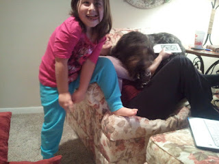 Back in Tejas, I spent a glorious few days in east Texas, mostly lounging around in pajamas. Life doesn't get much better, folks. Mudda fed us well, and we accomplished nothing other than sleep and laughs. Bentley is still a bit unsure about my niece since he probably harbors memories of her digging tunnels through his food bowl, so there was a small scuffle between the two of them, and now Maggie is a wee bit skeptical of Grace. My theory is that Grace's voice is even higher pitched (read: loud) than mine, and Maggie isn't so sure that the seven year old isn't out to steal her canine soul. Here are the two of them, both intent on sitting in my chair: