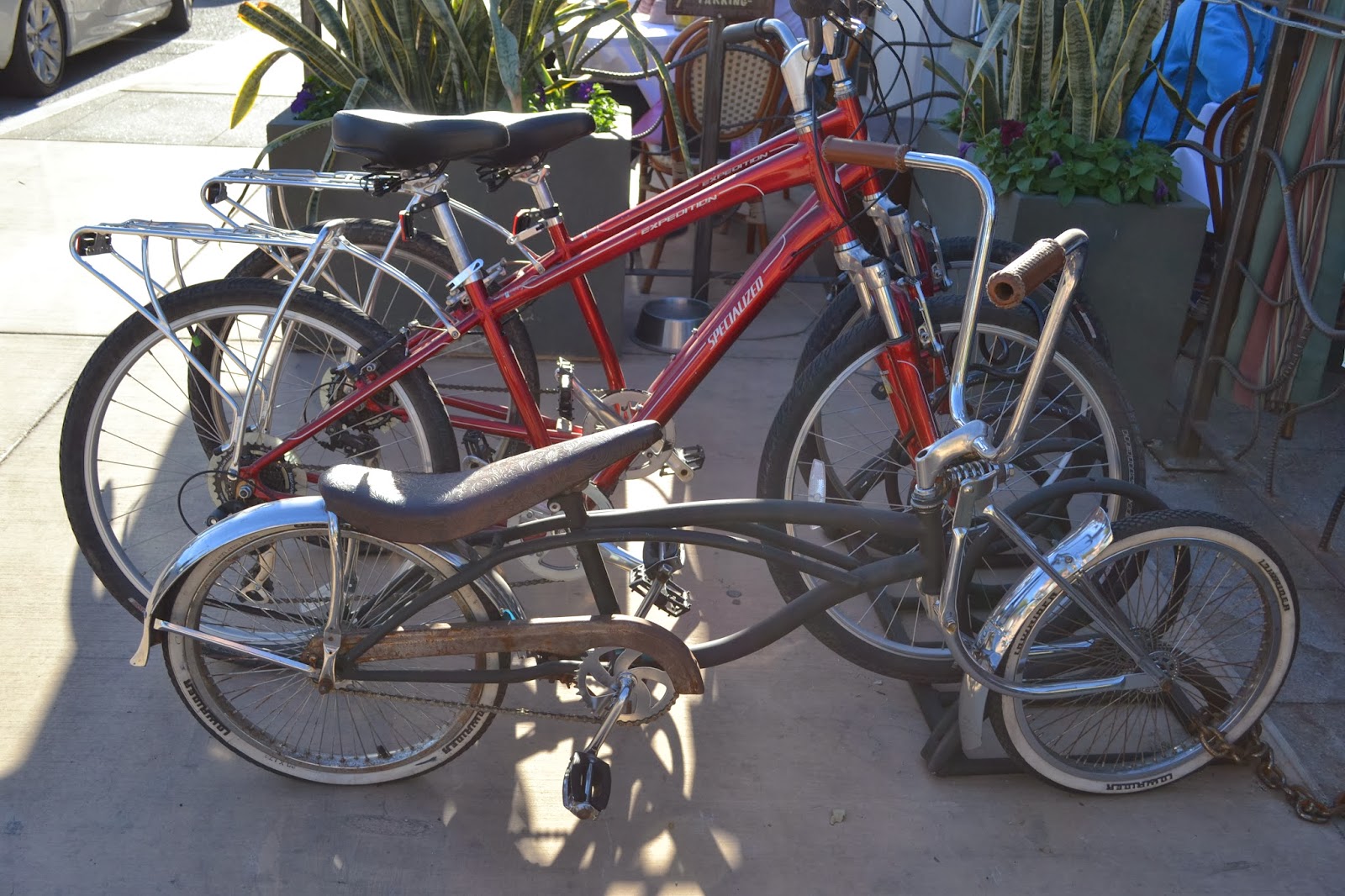 The area is chock full of history and I could easily envision cowboys and their cows ambling about the town, going about their cowboy and cowgirl business. First stop: refreshments at Barrio Queen, with a precious patio. We learned of this location when we braked our bikes next to some gals enjoying their own refreshments on a patio nearby, and asked for a margarita/patio/food recommendation. Here's a snap of our bikes parked next to the world's most stylish little person bike. The photo doesn't show this particular detail, but the bike seat is etched leather, a la flowers and like: