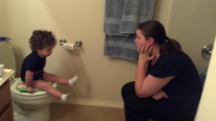 <no caption is needed, but the little person in the picture "has yet to pee in the toilet, but enjoys sitting on it for unlimited amounts of time">