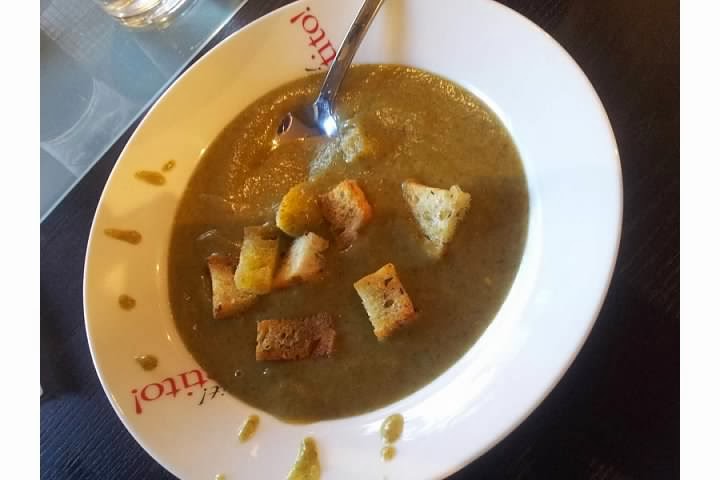 Spinach soup with garlic thyme croutons: