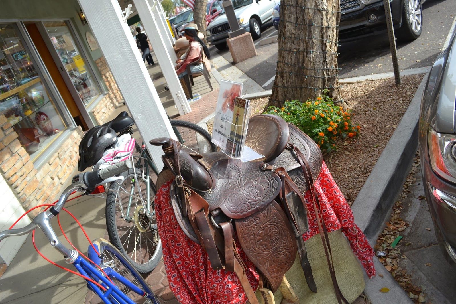The area is chock full of history and I could easily envision cowboys and their cows ambling about the town, going about their cowboy and cowgirl business. First stop: refreshments at Barrio Queen, with a precious patio. We learned of this location when we braked our bikes next to some gals enjoying their own refreshments on a patio nearby, and asked for a margarita/patio/food recommendation. Here's a snap of our bikes parked next to the world's most stylish little person bike. The photo doesn't show this particular detail, but the bike seat is etched leather, a la flowers and like: